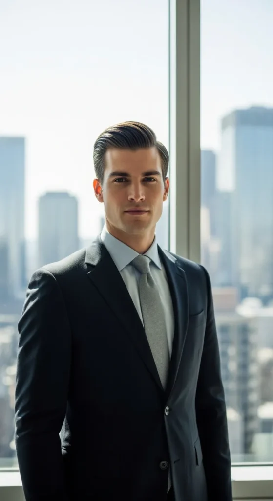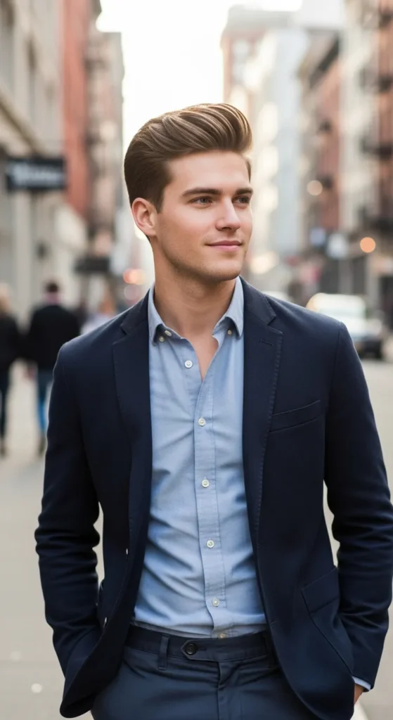 A glossy, swept-back style with a wet finish that looks effortlessly cool. It feels like you just stepped out into the city rain but still look perfectly styled.