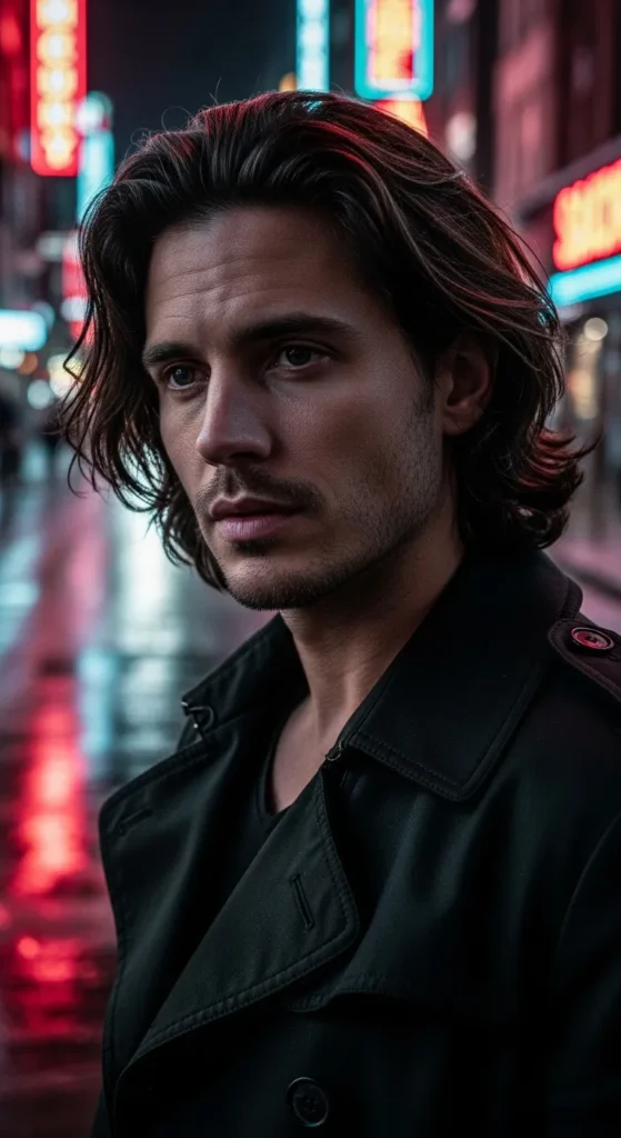 Dark, slightly longer hair styled with smooth flow and depth. It creates a bold, mysterious vibe that stands out without being loud.