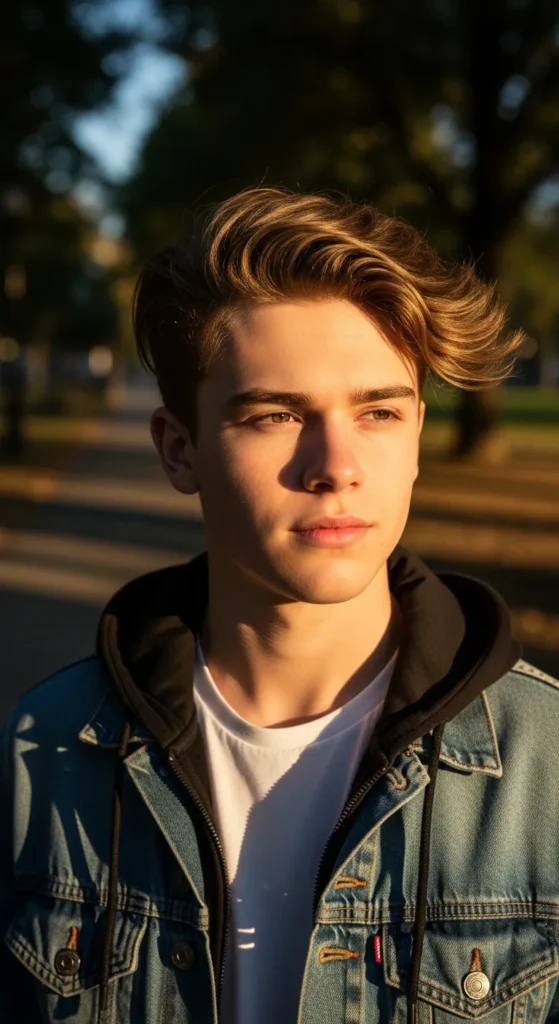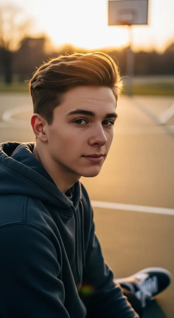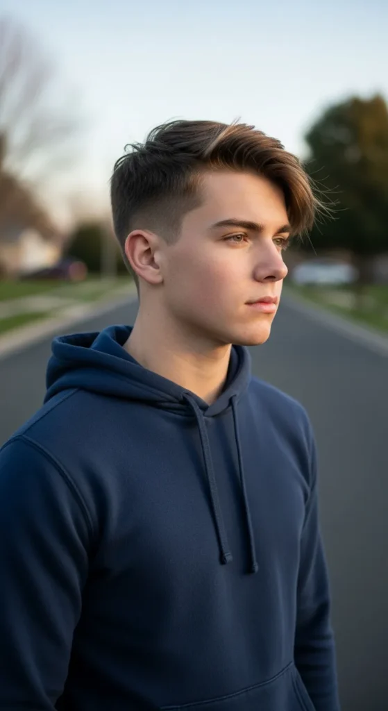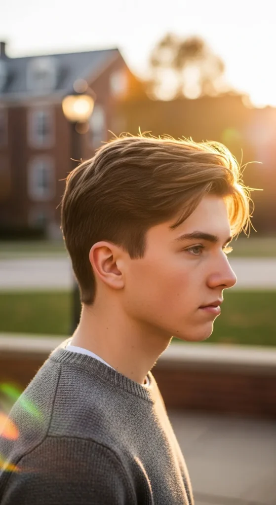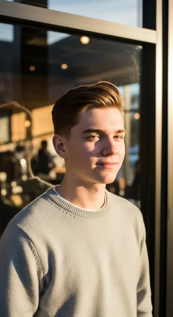 This hairstyle keeps a smooth flow toward one side with medium length on top and neat sides. It feels polished but still youthful, giving a tidy everyday look that works in both casual and slightly dressed-up settings.