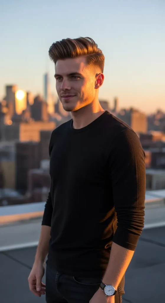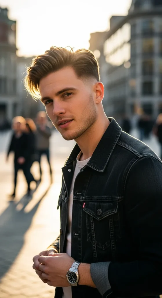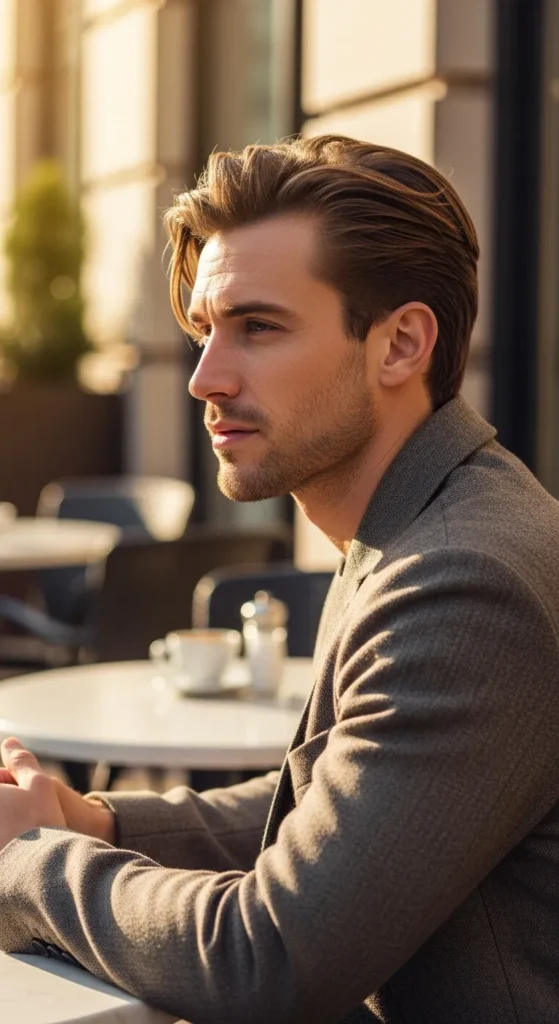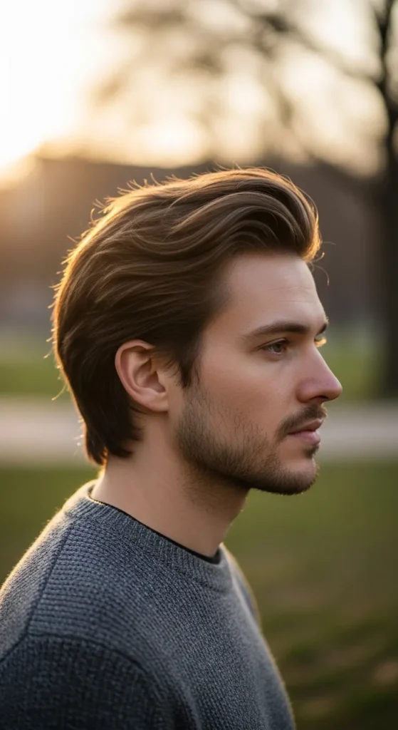This hairstyle allows slightly longer hair at the crown so the cowlick blends into the natural direction of growth. The result feels effortless and intentionally relaxed.