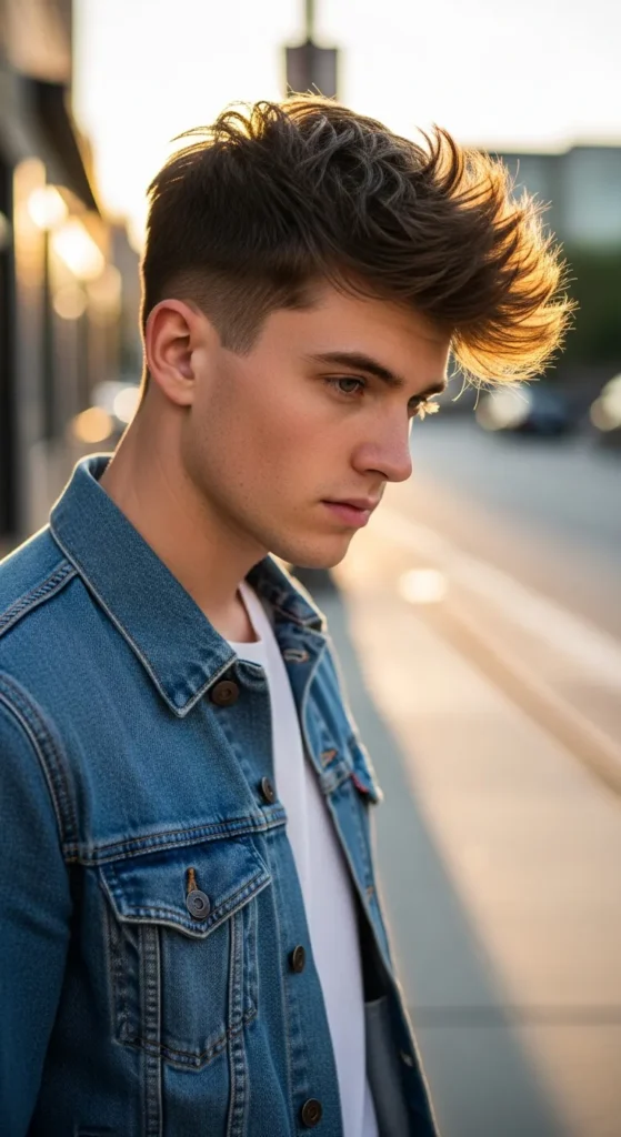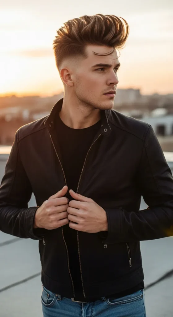 This bold quiff creates strong vertical height at the front, which instantly makes fine hair look thicker. The contrast between the lifted front and slightly shorter crown builds a striking silhouette without feeling overstyled.