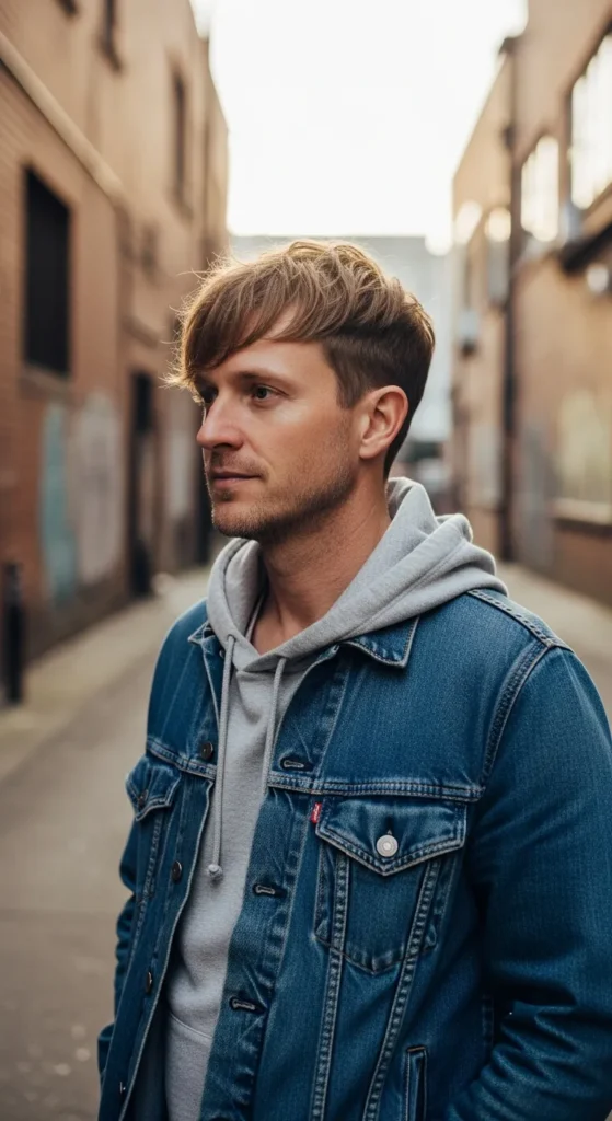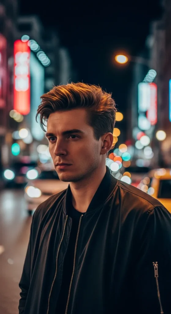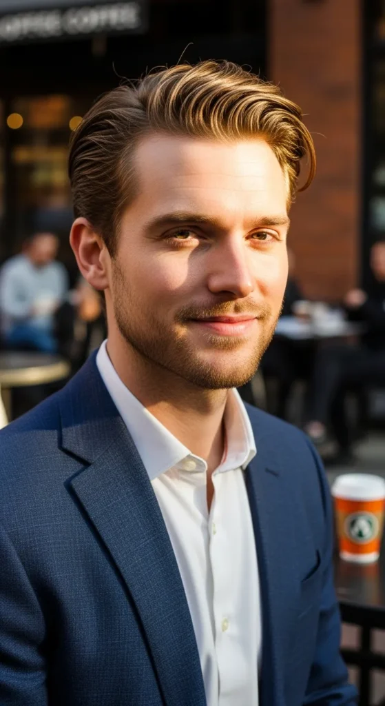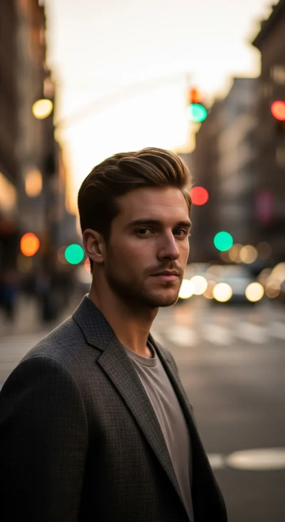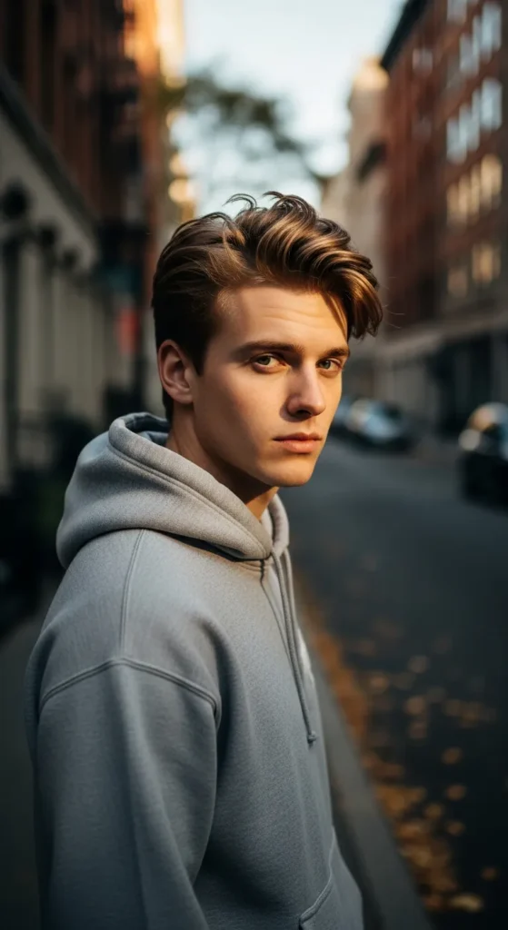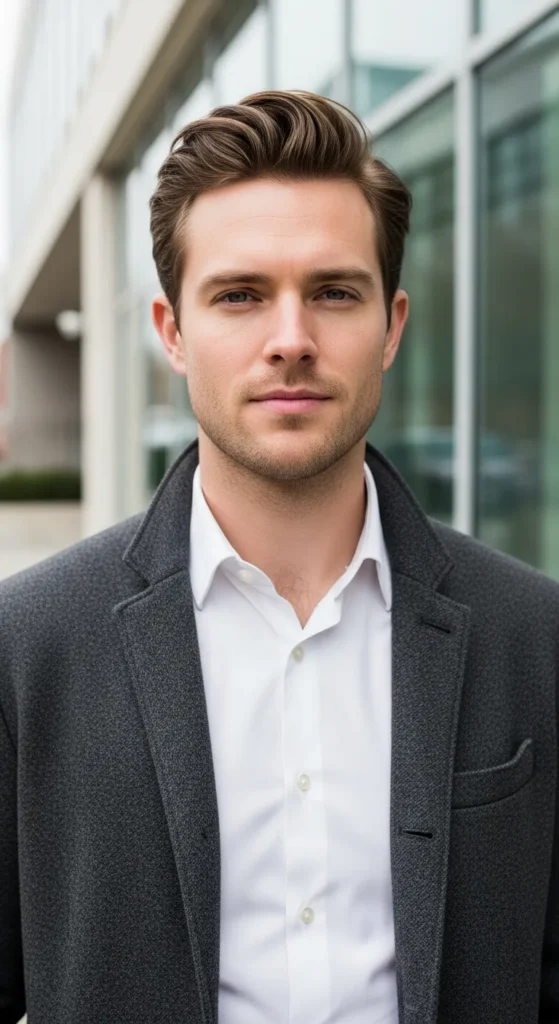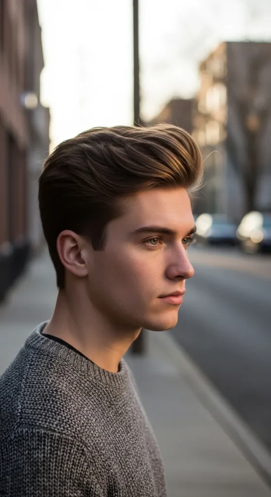 This hairstyle uses a lifted side part that looks natural and slightly windswept. The elevated side section adds structure and fullness, making fine hair look more dynamic and thicker.