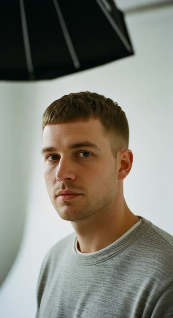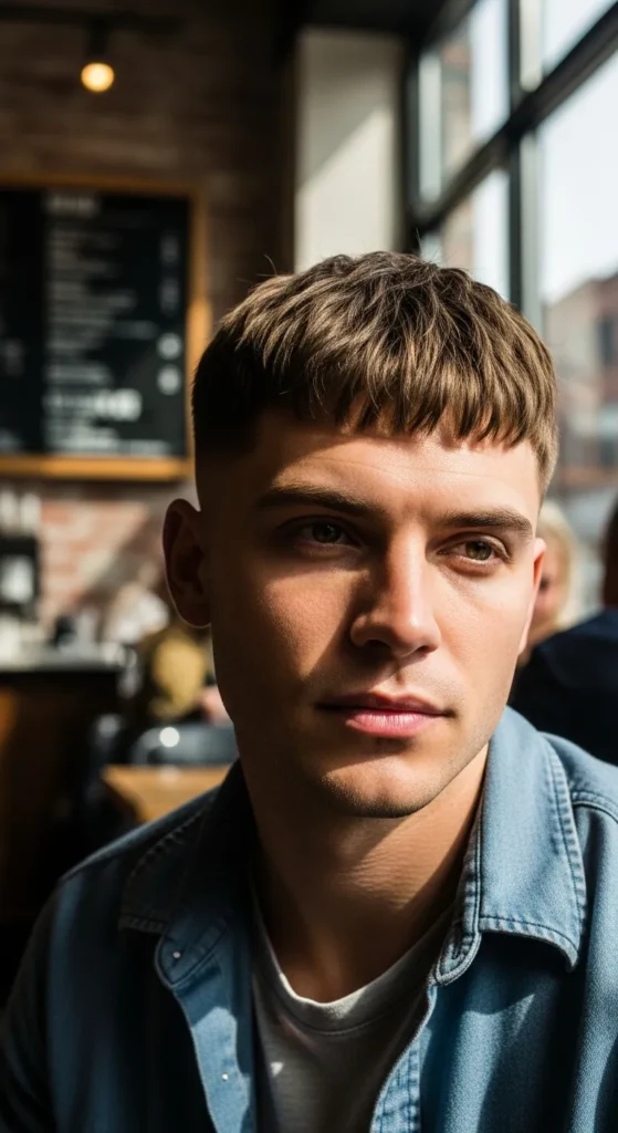 A modern Caesar cut with added lift and texture on top, breaking away from the flat traditional look.