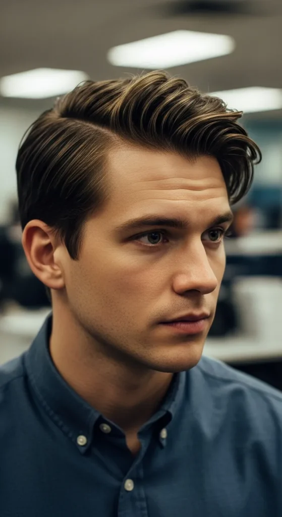 Barber Suggestion: Blow-dry with a round brush lifting from the front. This creates natural volume without forcing the hair backward too harshly.