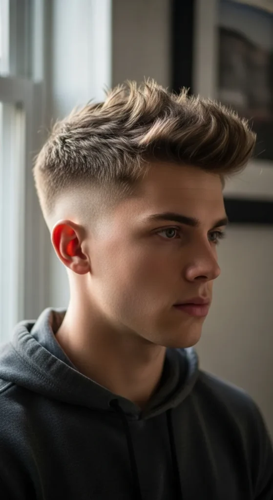 This cut focuses on short sides with a heavily textured top that builds fullness through controlled messiness. Perfect for creating density where hair feels flat.