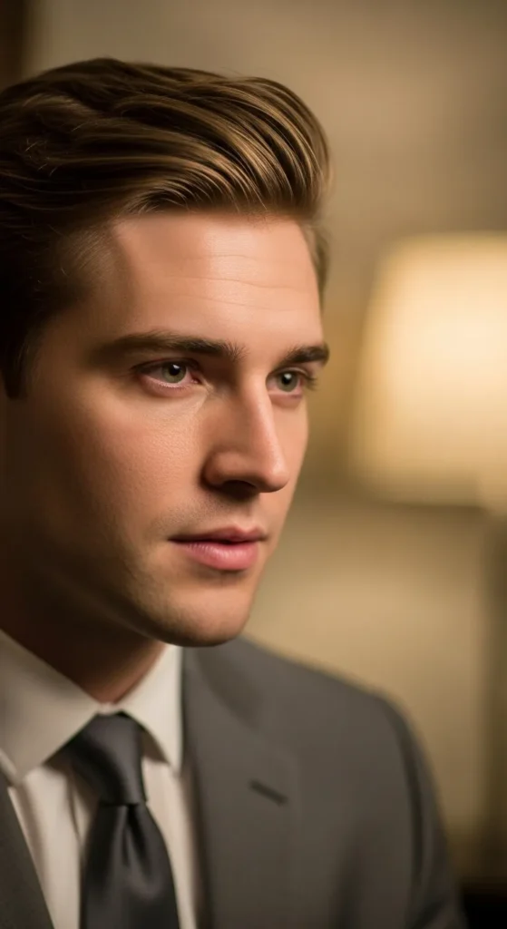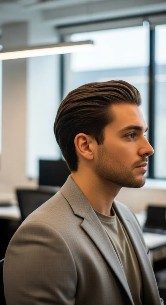 This style pushes the hair back with controlled volume, creating a confident and open appearance. It frames the face well and works especially for those wanting a mature, leadership-ready look.