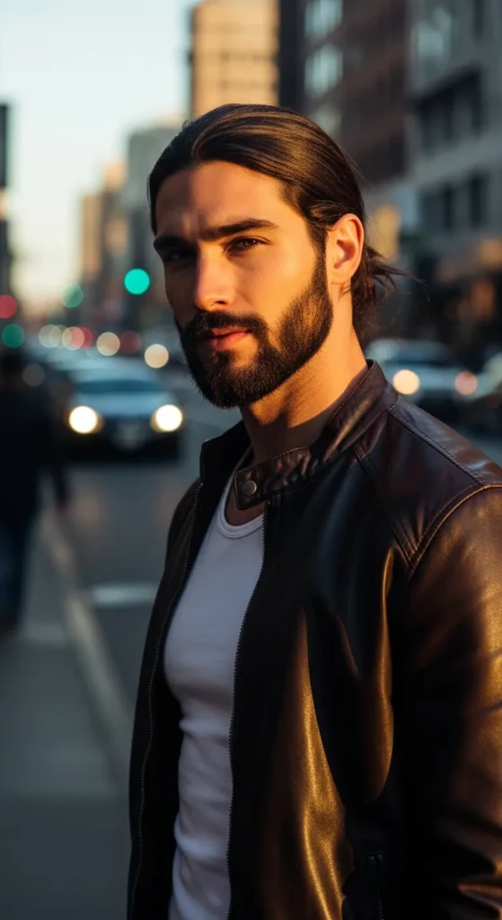 Long straight hair pulled into a low ponytail at the nape. Clean, sharp, and controlled, it’s minimal but still powerful, especially when paired with a beard.