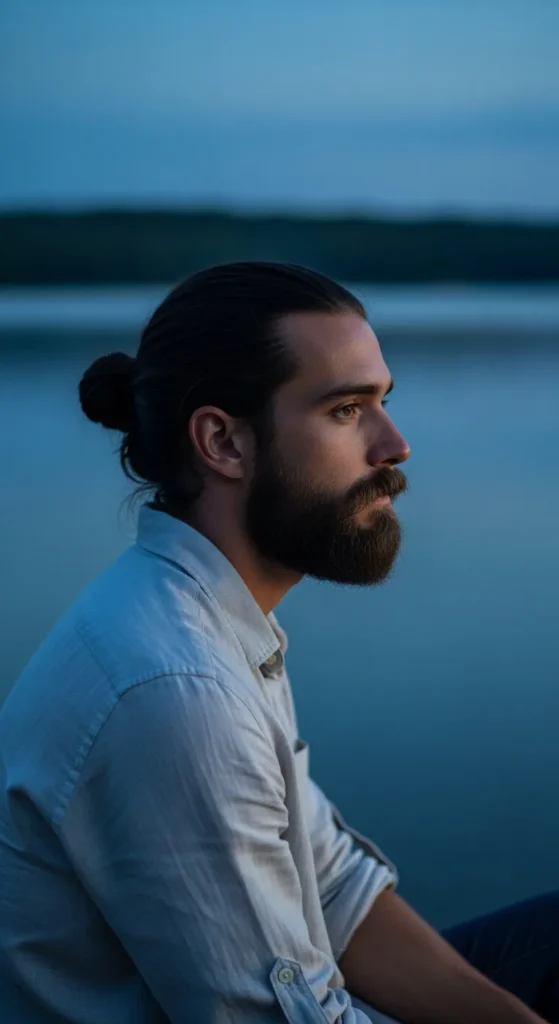 Low messy bun with loose strands around the face. It feels relaxed but masculine, ideal for days when you want control without losing length.