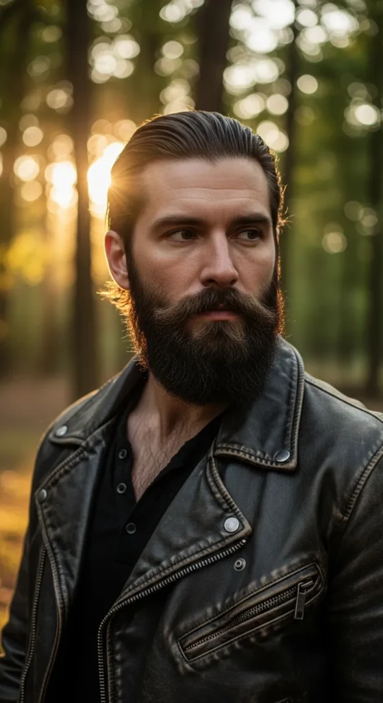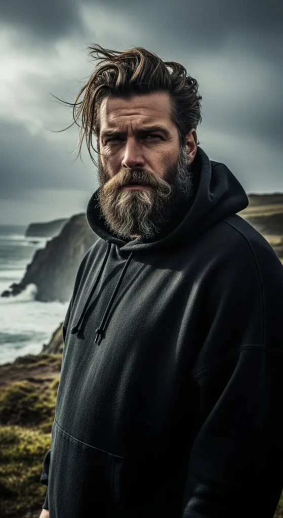 Thick long hair brushed back with strong volume and paired with a bold beard. It’s powerful and commanding without needing tight styling.