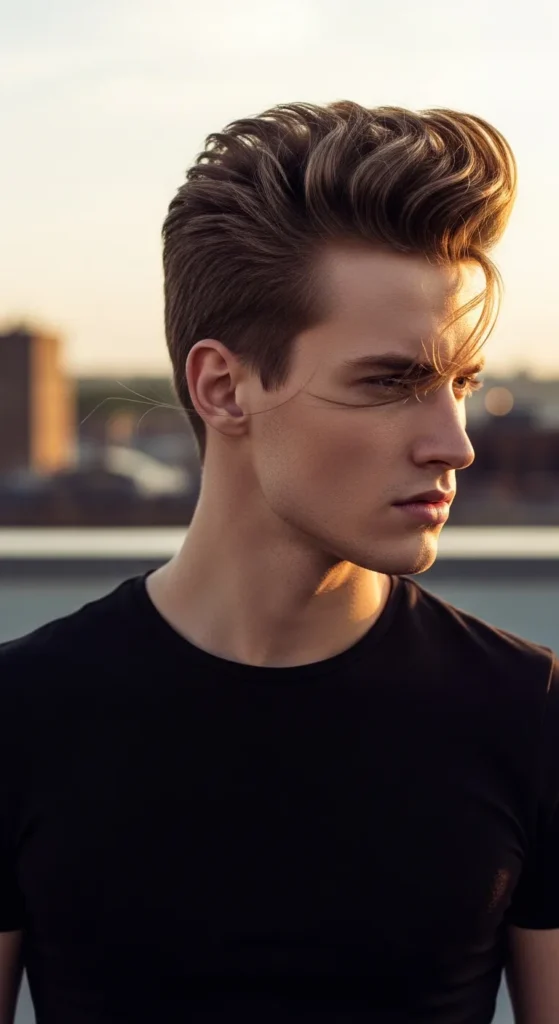 This isn’t a tall quiff, it spreads outward rather than upward. The volume expands sideways, giving a fuller appearance while still maintaining a stylish lift.