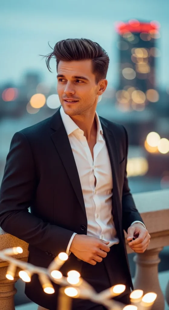 Barber Suggestion: Use a round brush when blow-drying to shape lift at the roots. Finish with a medium-hold pomade so the volume stays controlled without looking stiff.