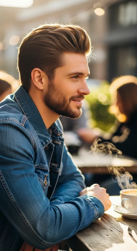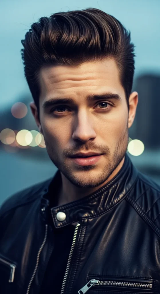 A modern pompadour with tighter sides and moderate height. Instead of extreme lift, this version focuses on structure and control, keeping thick hair elevated but polished rather than dramatic.