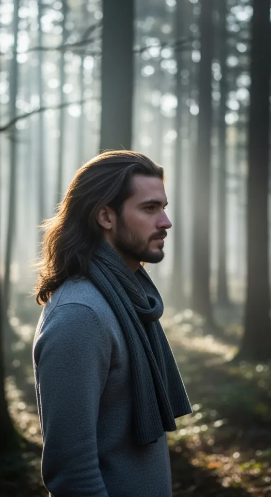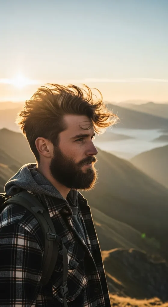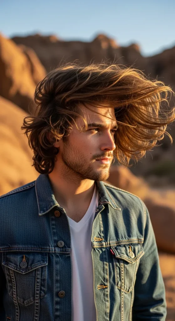 This hairstyle uses longer feathered layers with a slightly rugged texture that looks adventurous and free. The hair flows naturally with a bit more volume, giving it a confident mountain-explorer vibe.