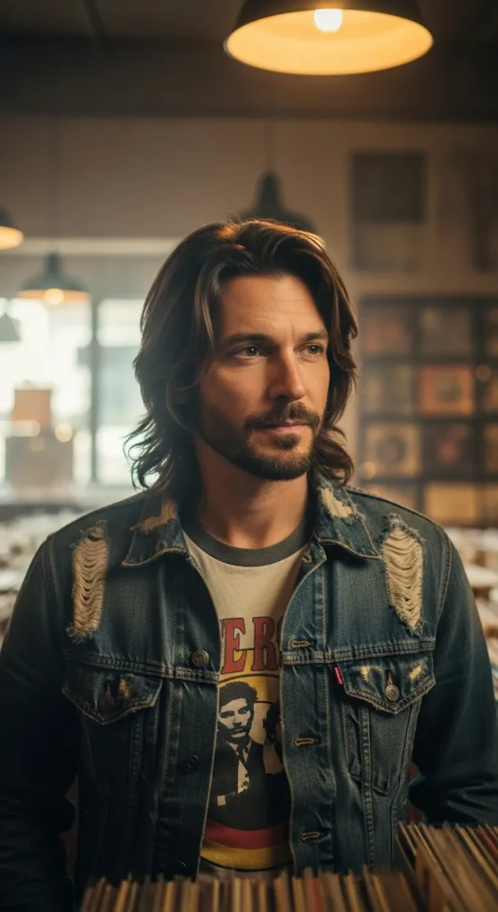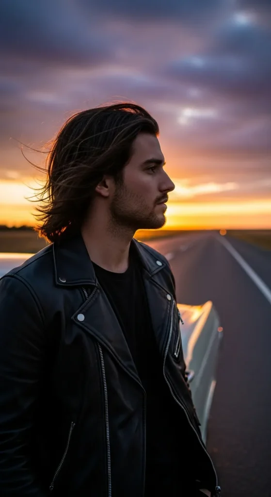 Inspired by classic road-trip energy, this feathered style features long layers that stretch past the shoulders with airy separation. It feels rugged, masculine, and full of movement like a retro rock star driving down an open highway.