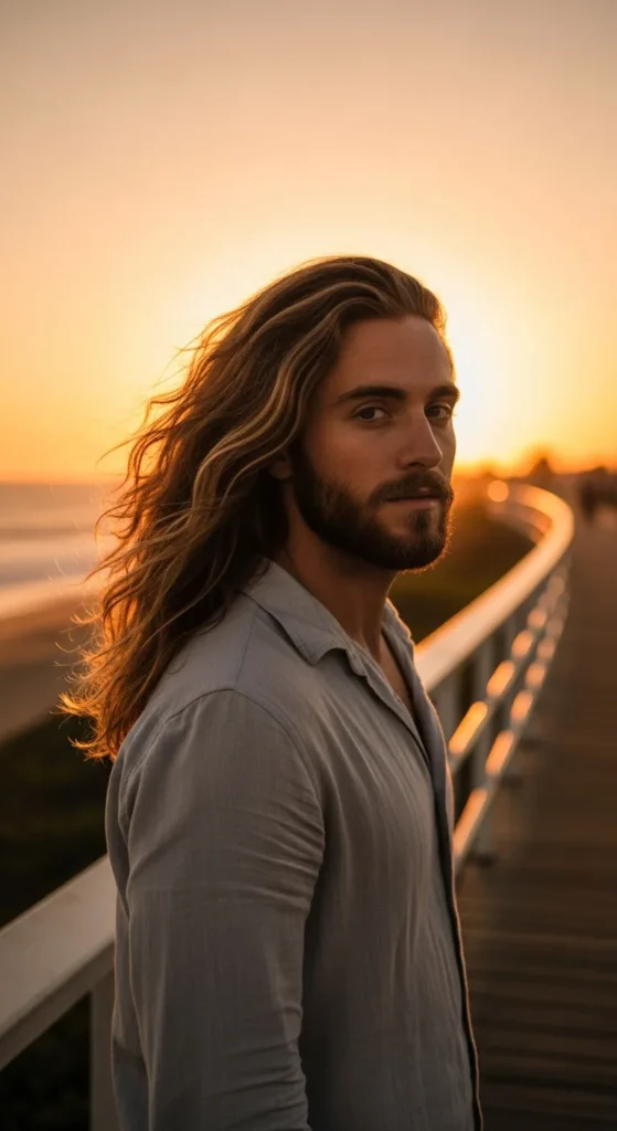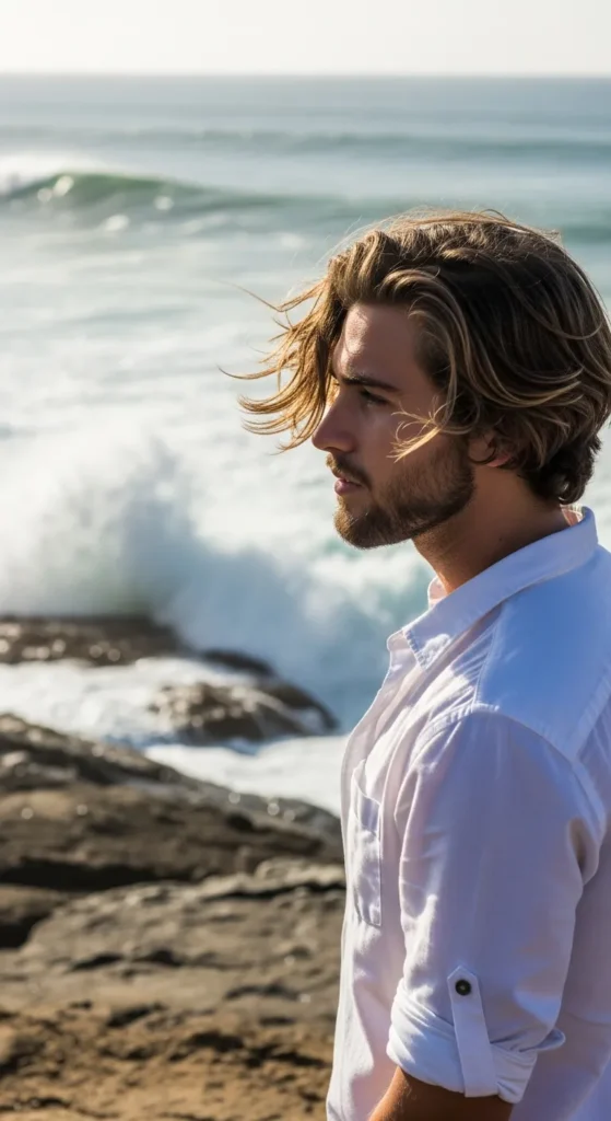 Long feathered layers fall naturally with a gentle drift that mimics ocean wind. The hair looks light, breezy, and slightly textured, creating a calm and relaxed aesthetic that suits men who prefer effortless style.