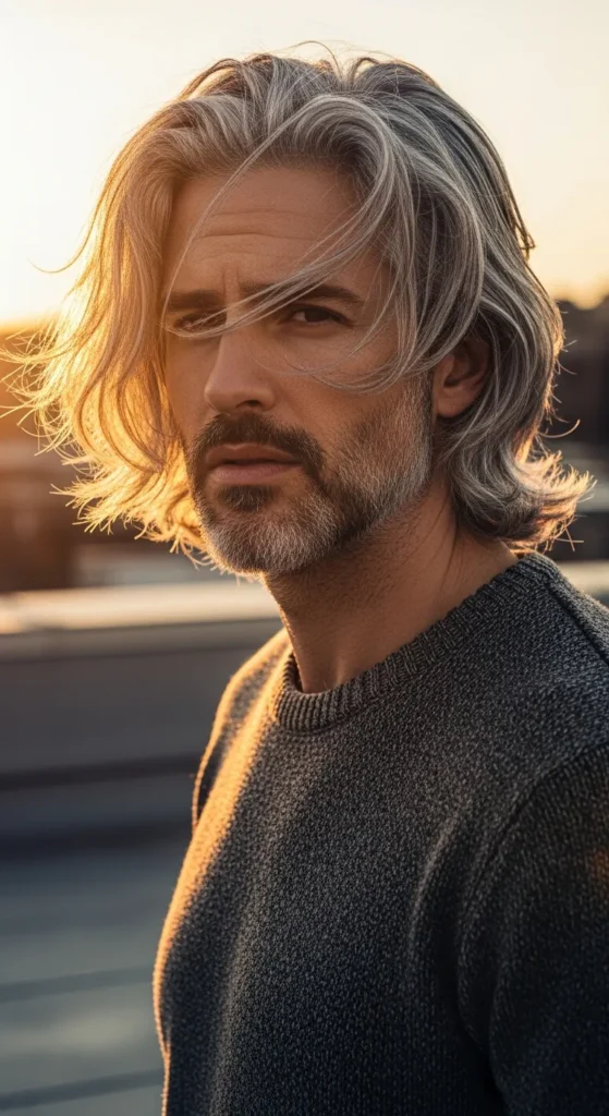 This version embraces long feathered layers with subtle salt-and-pepper tones that move softly around the face. The style feels refined yet relaxed, giving a confident retro presence without looking overstyled.