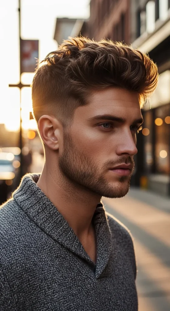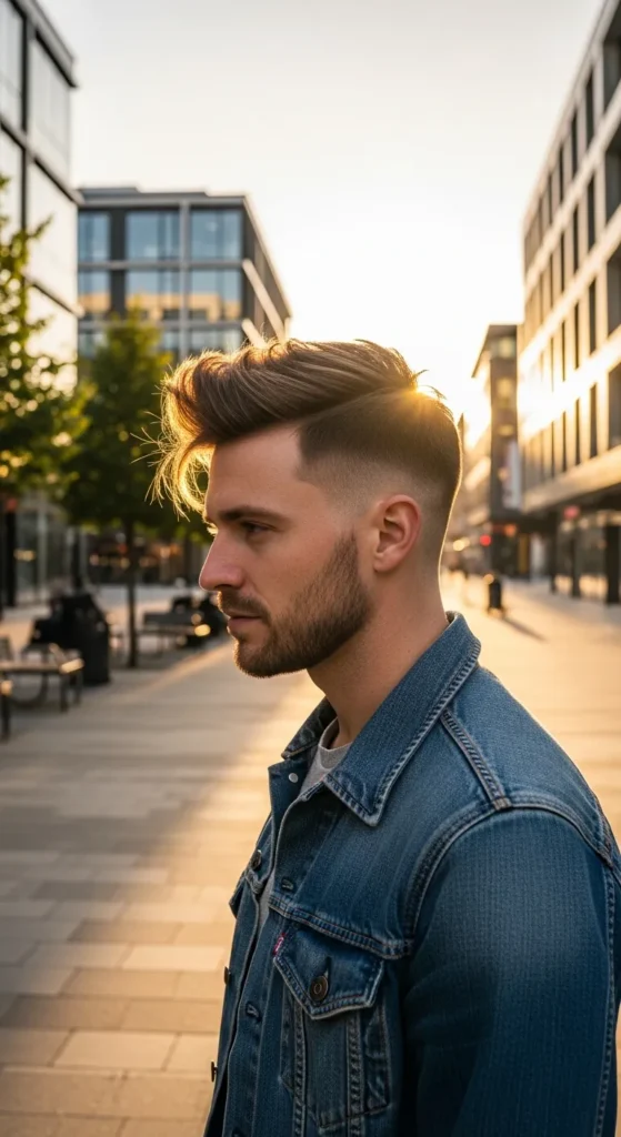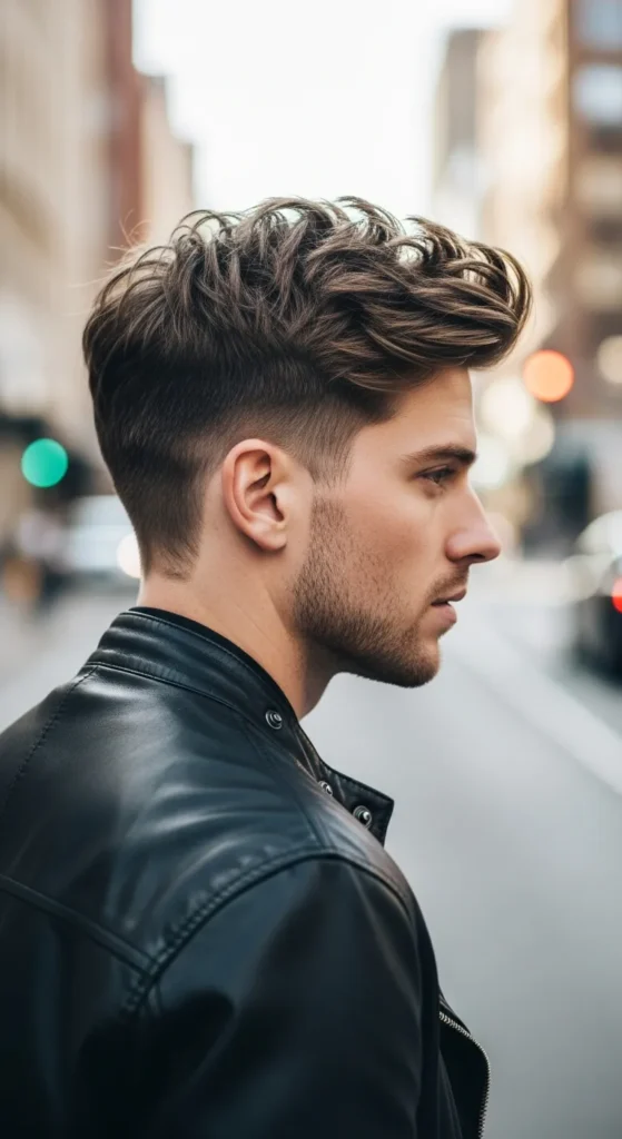 This style pushes the top hair forward and upward with strong texture. The movement creates a dynamic, fast-looking hairstyle that stands out immediately.