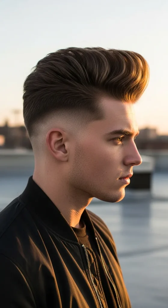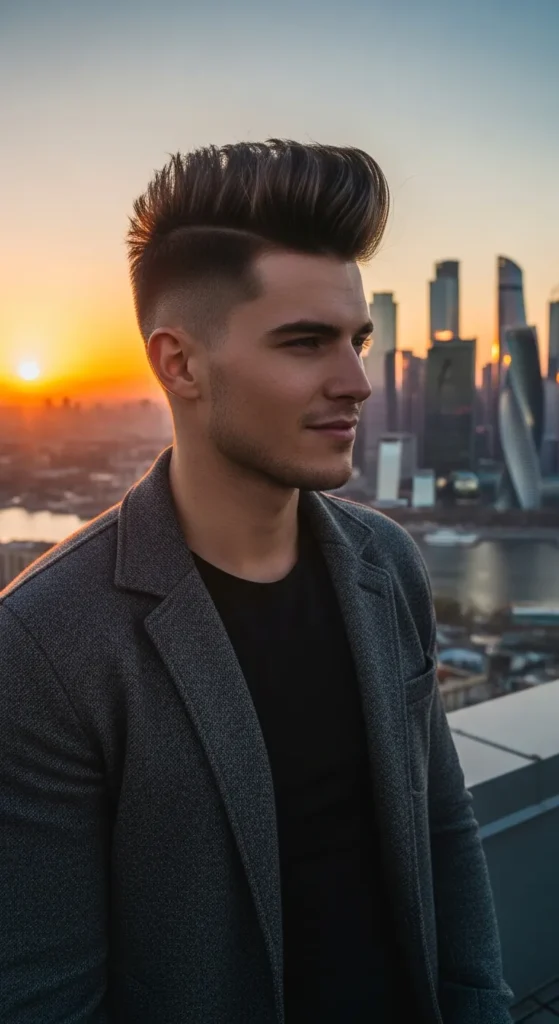 A bold undercut with height concentrated at the crown area, creating a strong silhouette. The style looks confident and stylish while maintaining a balanced shape from front to back.