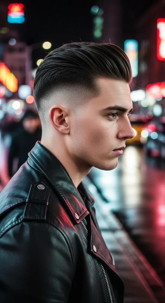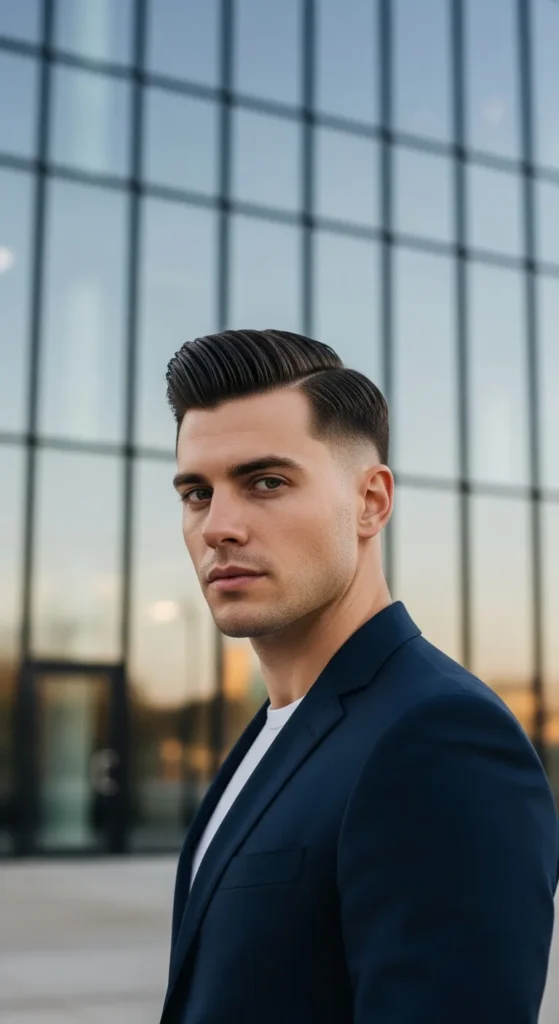 A bold, polished undercut with a slicked-back top that shines with confidence. The clean contrast between the tight sides and glossy top makes this style perfect for men who like sharp, intentional grooming.