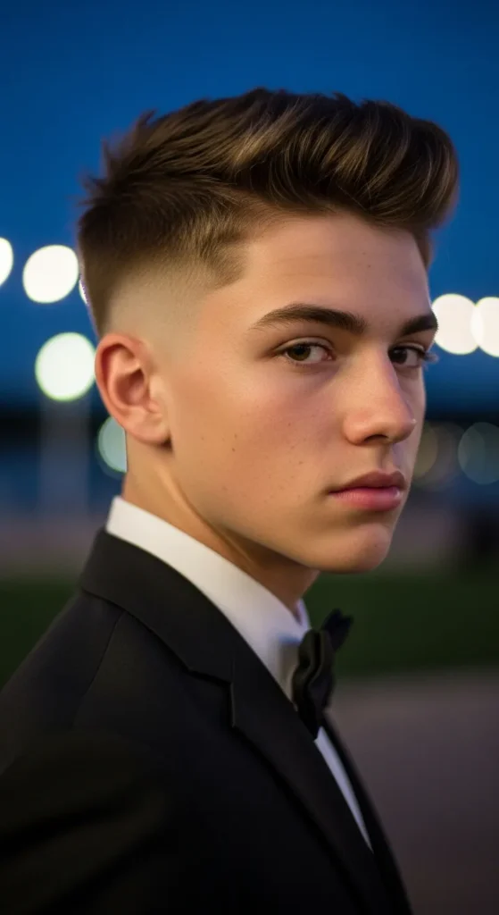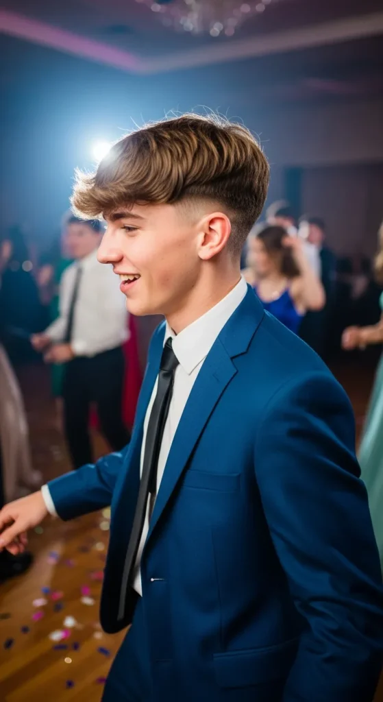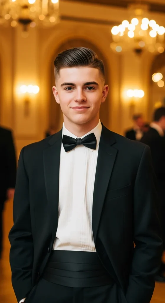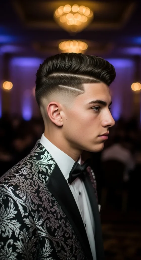 A defined side part with a smooth top and faded sides creates classic prom elegance with a modern edge.