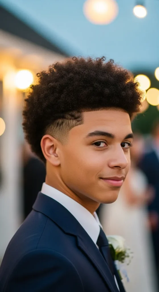 Defined curls shaped neatly on top with clean tapered sides create a regal but relaxed look. Crown Curls embrace natural texture while keeping everything structured and prom-ready.