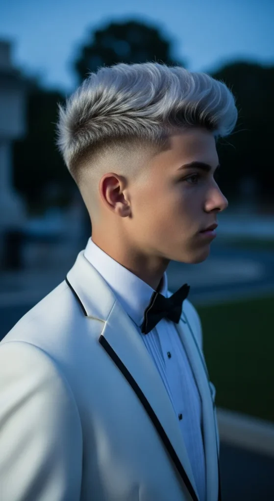 A subtle platinum or ash-blonde top with darker faded sides makes this cut instantly eye-catching. It’s bold without being loud, perfect for someone who likes controlled attention.