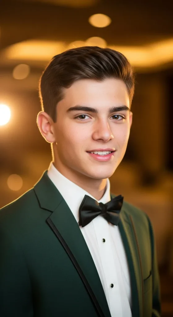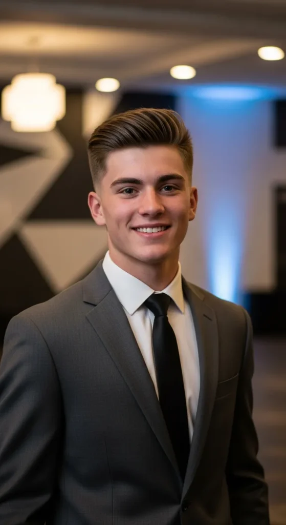 Barber Suggestion: Ask for a skin-to-mid fade blend that’s seamless. Use a lightweight matte cream instead of heavy gel so your hair keeps movement all night without looking crunchy under flash photography.