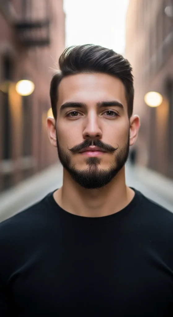 A modern, thinner chin strap connected with light mustache detail. It outlines the jaw sharply and works especially well for men wanting stronger facial structure definition.