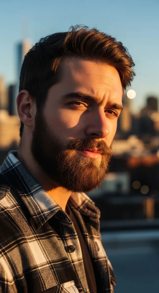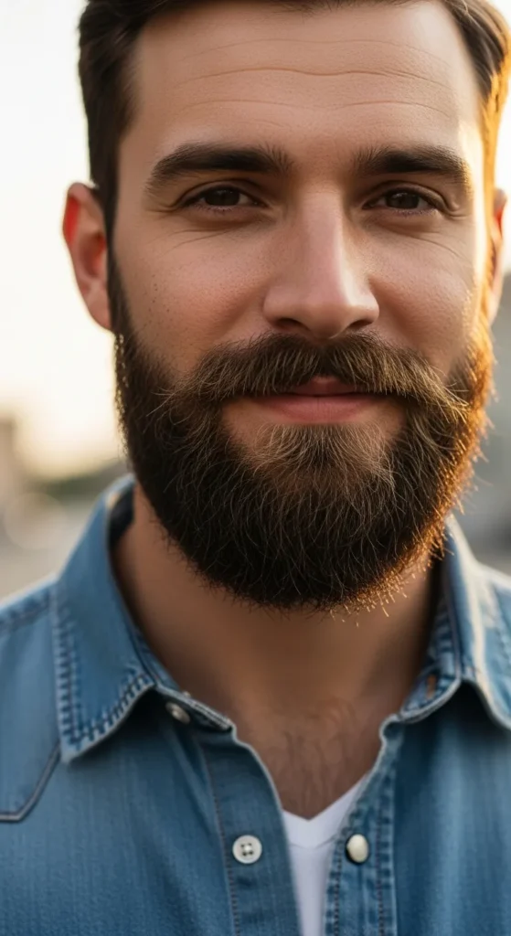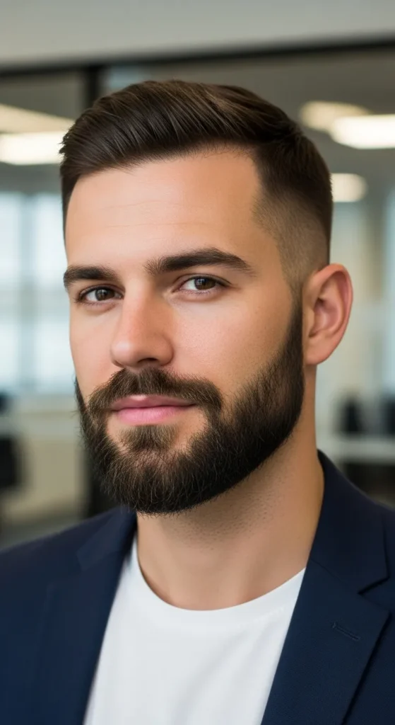 A full beard kept tightly cropped close to the skin. It gives fullness without bulk and works great for guys with dense growth who don’t want long length.