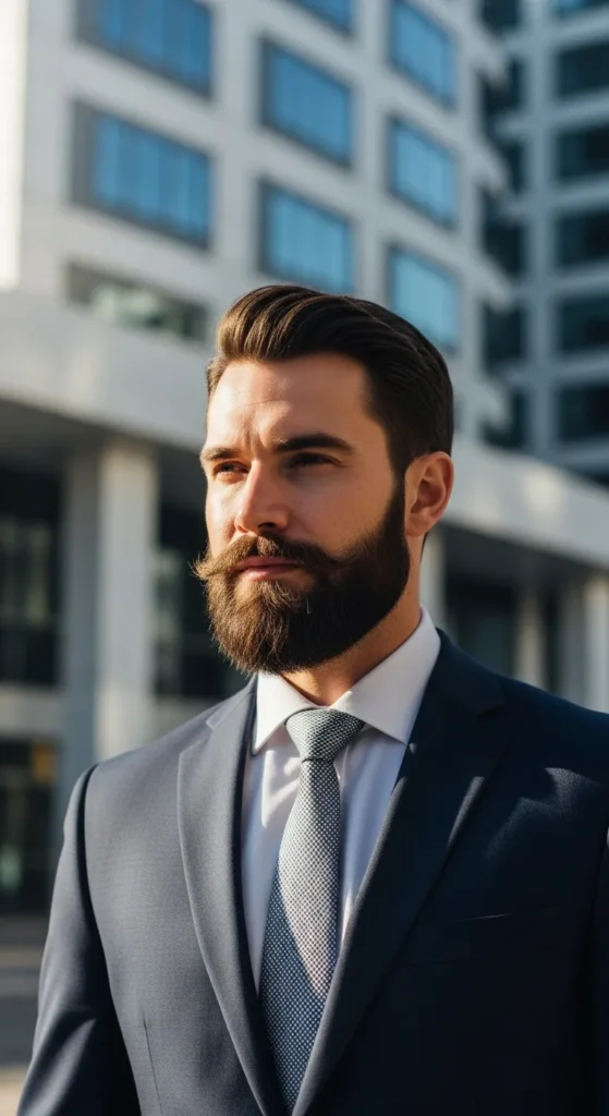 Even-length short beard with razor-clean cheek and neckline. Professional, masculine, and structured, the kind of beard that works with suits and sneakers alike.