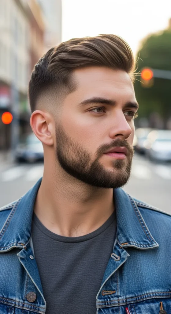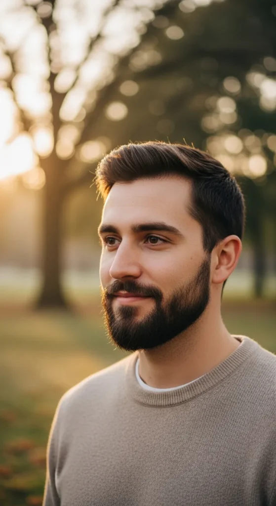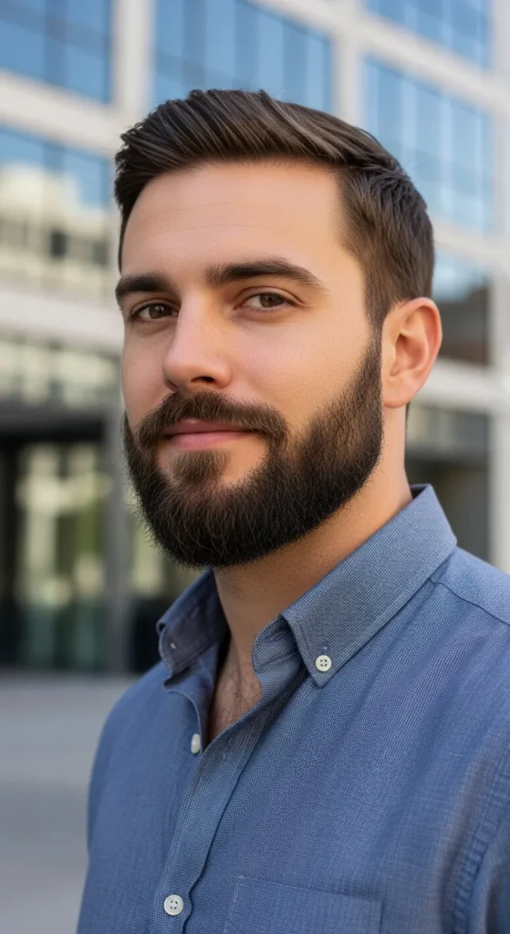 A short beard with slightly blended cheek lines rather than razor-sharp cuts. It feels natural yet tidy, perfect for guys who want clean without looking overly sculpted.