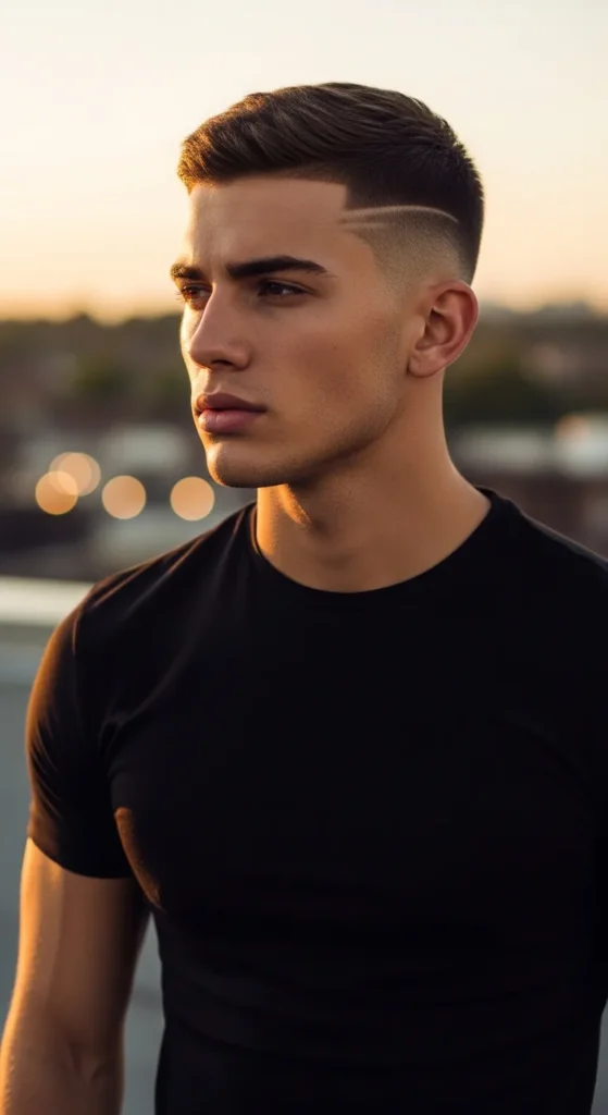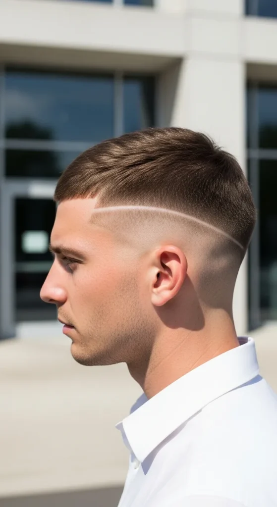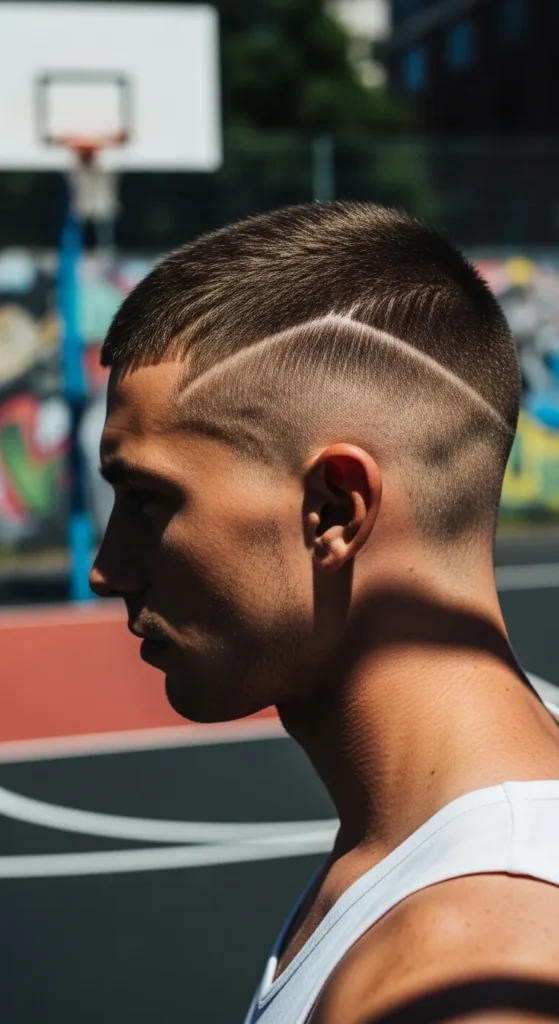 A crisp shaved line cuts through a short buzz, adding instant attitude without overcomplicating the look. It’s bold, minimal, and feels like a signature style rather than just a haircut.