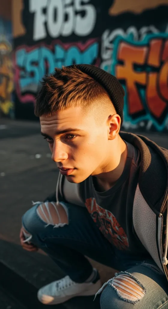 A slightly uneven, gritty buzz with natural texture that feels raw and street-inspired. It’s imperfect in the best way, giving off confident, effortless energy.