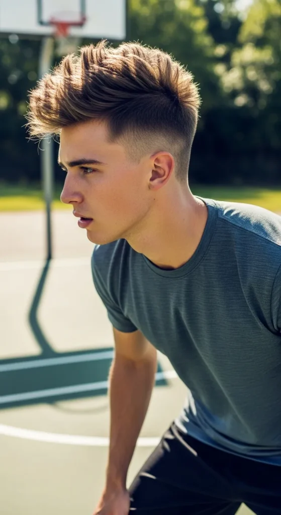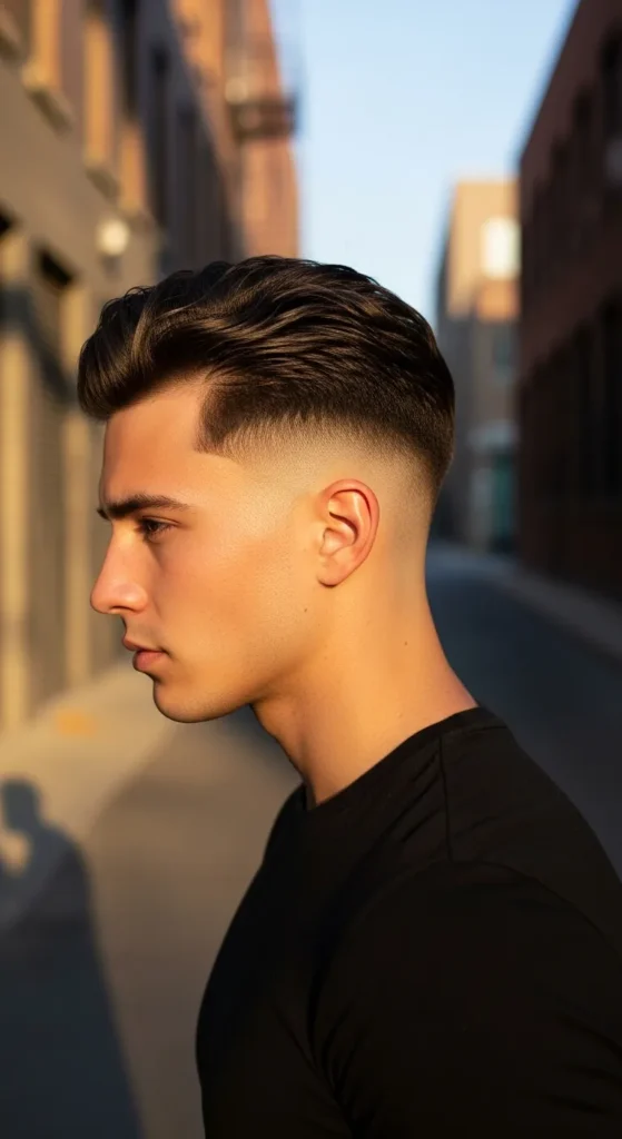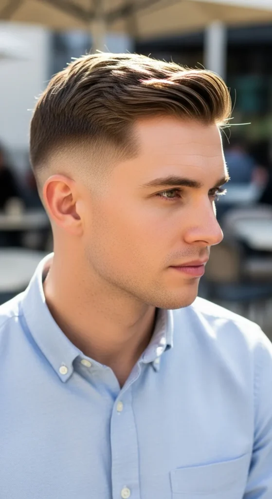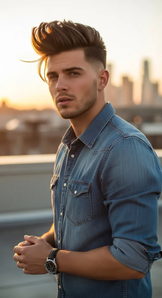 A voluminous quiff on top paired with a low skin fade creates contrast that instantly grabs attention. It’s bold, stylish, and surprisingly breathable for hot days.