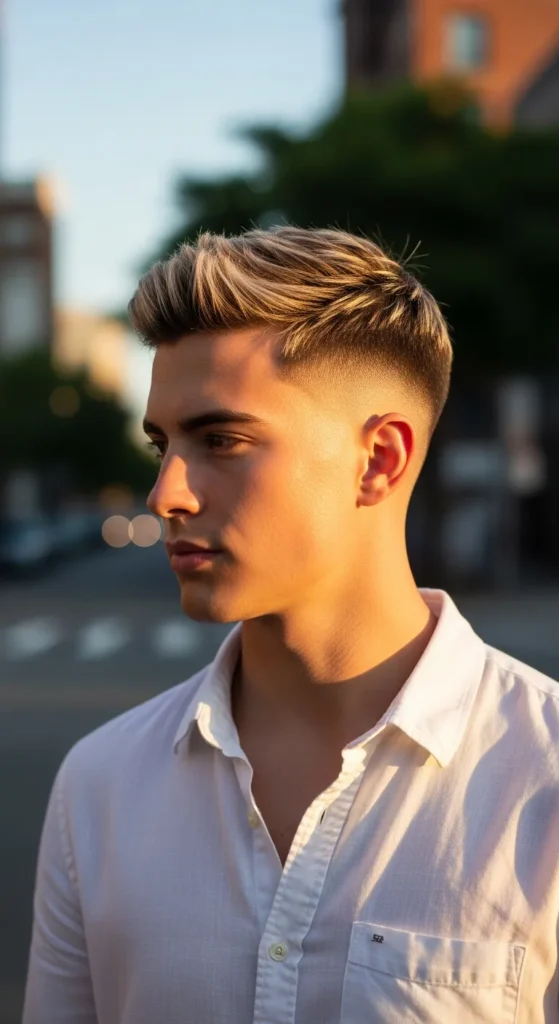 Short spiky texture on top with a high fade gives an edgy, energetic vibe that works perfectly in hot weather without feeling heavy.