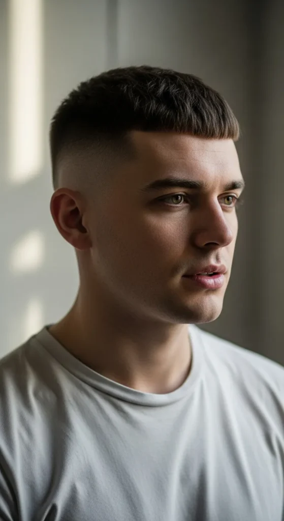A short Caesar cut with a tight fade gives a strong, masculine look that requires minimal effort but always looks put together.