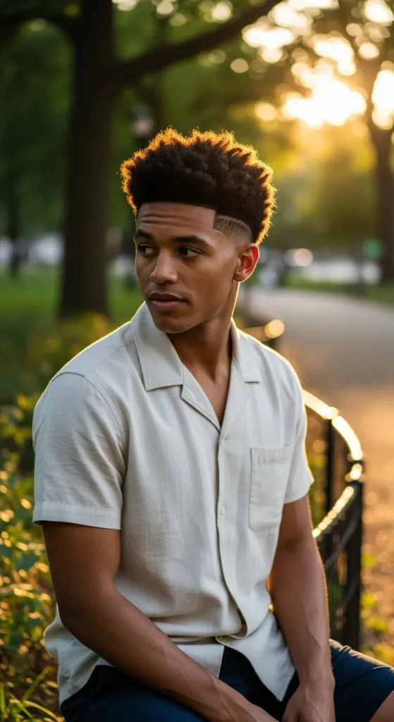 A natural afro with a clean taper fade keeps things bold while maintaining shape and structure. It’s breathable yet full of personality.