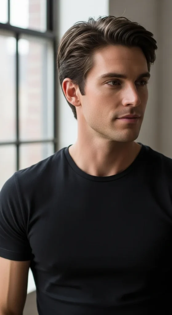 A relaxed quiff with soft height creates vertical volume, while lighter sides keep it breathable. It’s controlled but not stiff, ideal for natural fullness.