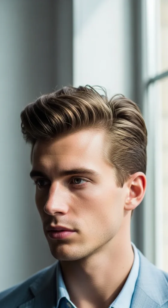 A lighter version of the classic quiff with controlled height and breathable volume. It gives structure without trapping heat, ideal for men who want style without the heavy feel.