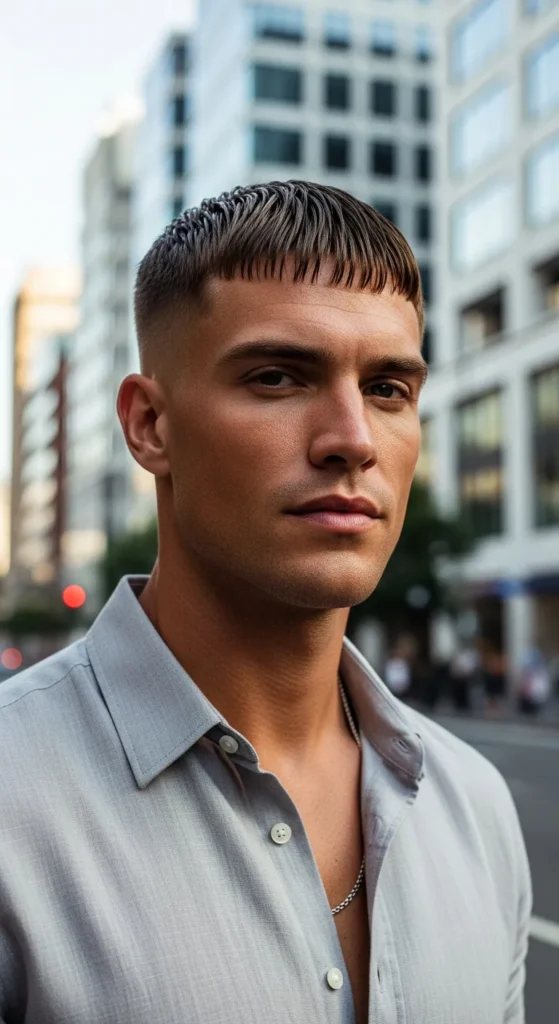 A modern Caesar with tighter sides and a short fringe that controls sweat and stays structured. It’s practical, clean, and quietly stylish for everyday summer life.