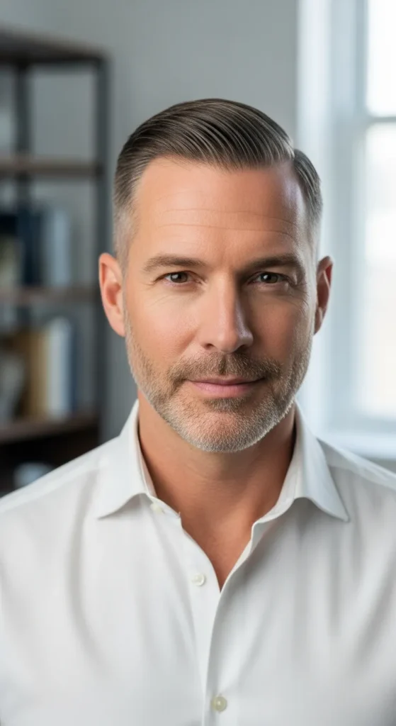 Barber Suggestion: Ask for a slightly longer top to avoid looking too rigid. A matte paste can add subtle texture without shine. Regular edge-ups every couple of weeks will keep the clean look intact.