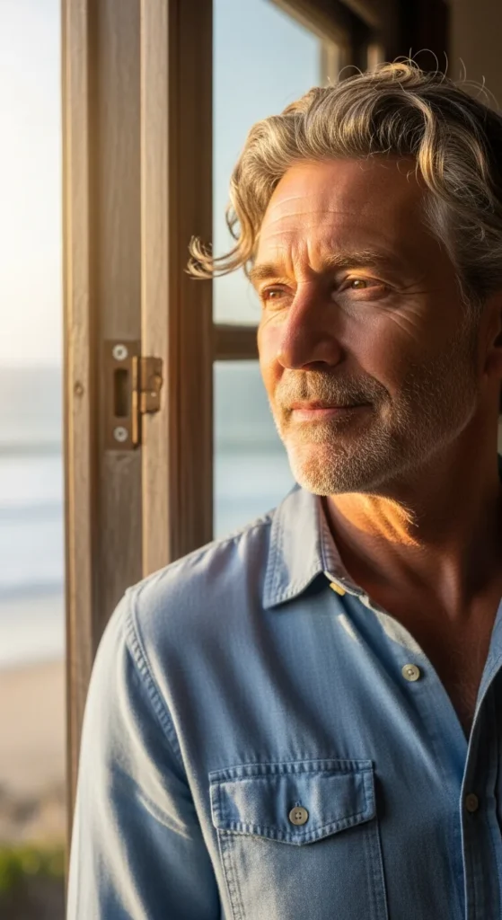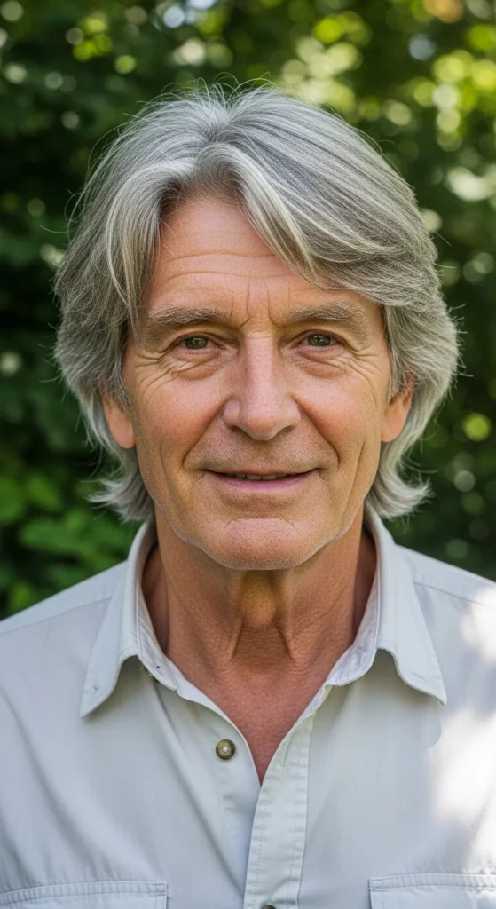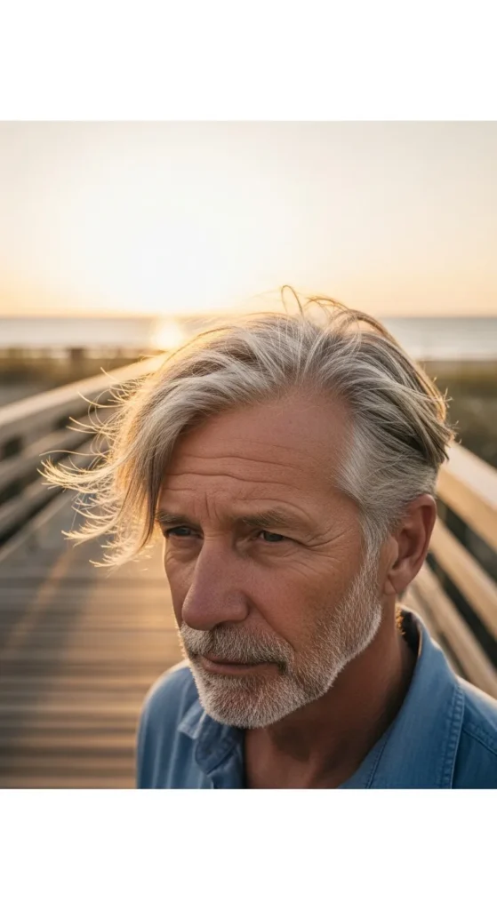 A loose side-part style that feels like it belongs near the ocean. The hair naturally falls to one side with soft volume, creating a breezy, relaxed look that works beautifully with gray or white hair.