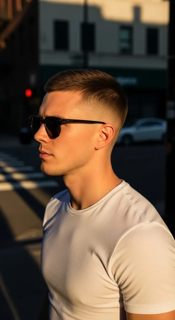A clean buzz with a subtle shadow gradient gives just enough texture without trapping heat. It feels incredibly light, looks sharp in sunlight, and works effortlessly whether you’re dressed casual or slightly elevated.
