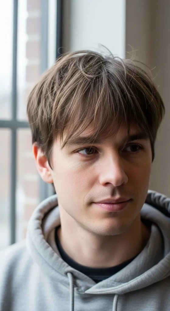 Instead of a full heavy fringe, this style uses a broken, slightly parted fringe to create gaps that add visual thickness. It frames the face while keeping the overall look light.