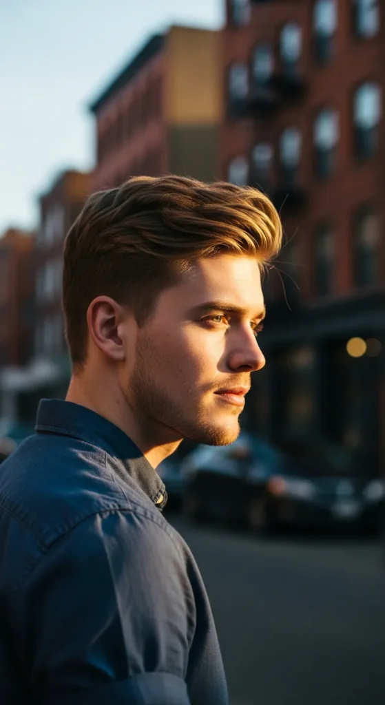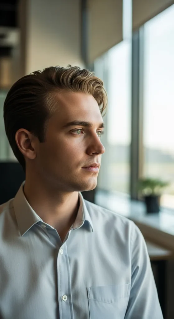A subtle part combined with lifted roots creates a fuller illusion while keeping the style clean and modern. It works well for both casual and formal settings.