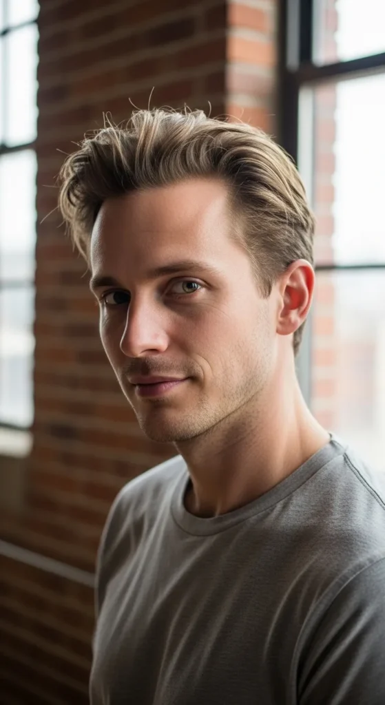A subtle, shorter quiff that focuses on lifting the front section just enough to add height. It avoids heaviness while giving the illusion of density at the hairline.