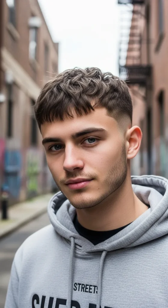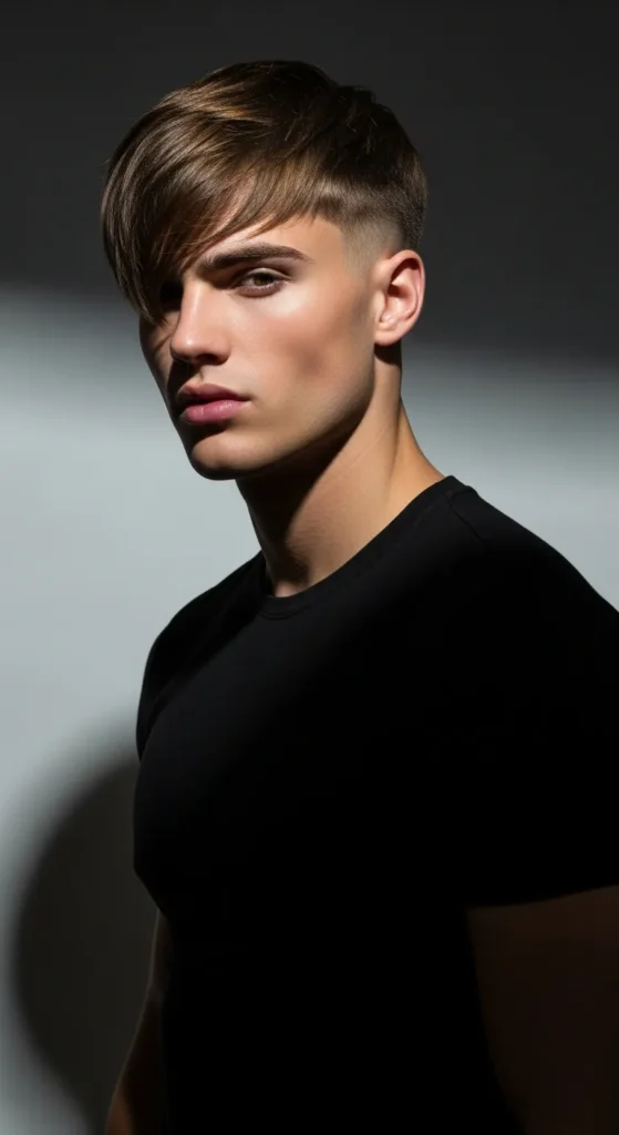 A sharp, slightly uneven fringe meets a clean skin fade, giving a bold edge without trying too hard. It’s relaxed but still precise, making it perfect for everyday style.