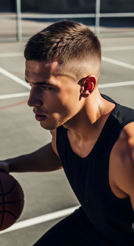 Inspired by classic military cuts, this ultra-tight skin fade with a short top delivers maximum cleanliness and zero maintenance feel.