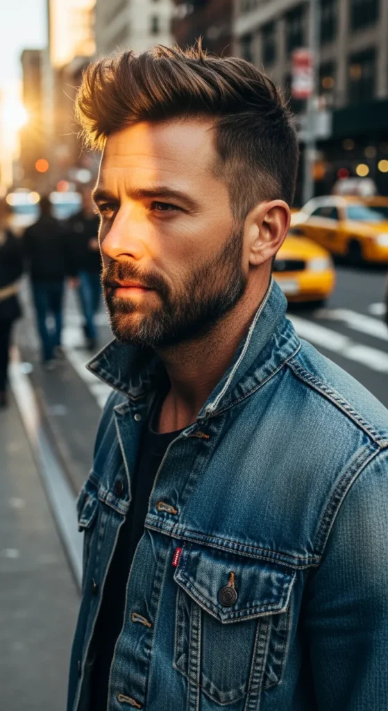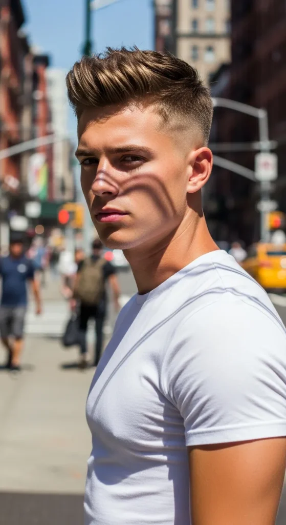 Short, controlled spikes paired with a skin fade give a clean yet energetic look. It’s low effort but still gives off that fresh, styled appearance.