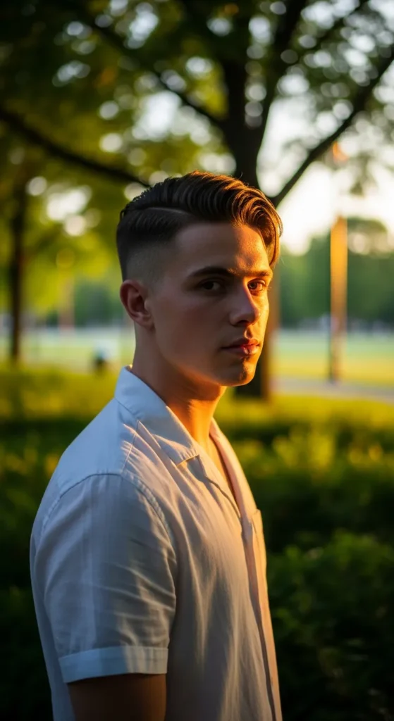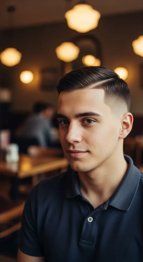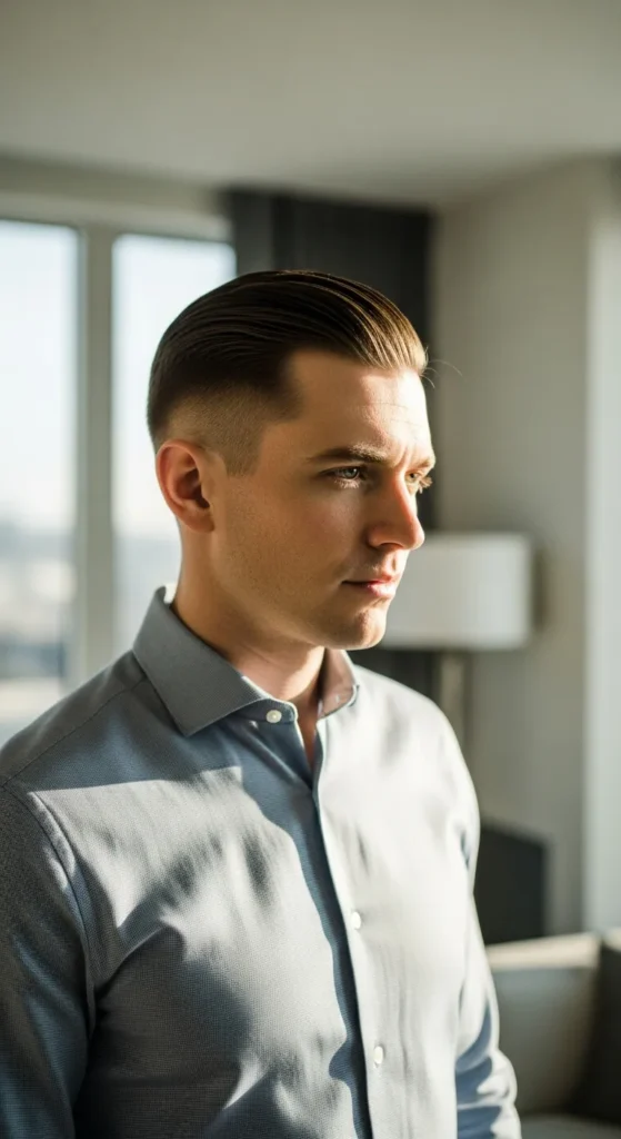 Barber Suggestion: Keep the top slightly longer on one side to enhance the sweep naturally, reducing the need for constant restyling throughout the day.